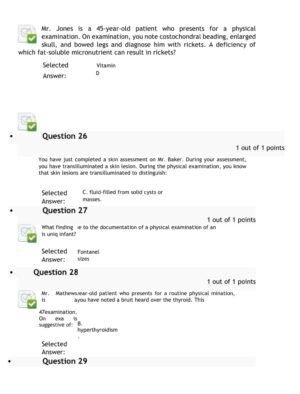 This document provides 100 real questions with correct answers from the NURS6512 Advanced Health Assessment midterm exam, updated for the 2025 academic year. It covers advanced physical examination techniques, comprehensive patient assessments, diagnostic reasoning, interpretation of clinical findings, differential diagnoses, and evidence-based care planning. Fully graded A+, this resource is aligned with NURS6512 course objectives to ensure accurate and effective preparation.