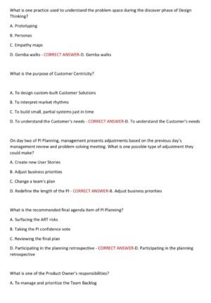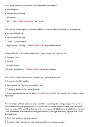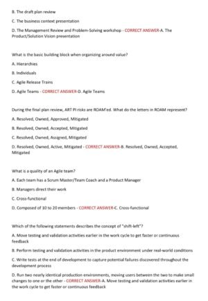 The Agile SAFe 6.0 Certification Exam 2025–2026 package provides 200 actual exam-style questions with 100% correct verified answers, ensuring you master Lean-Agile principles, Agile Release Trains (ARTs), PI Planning, DevOps, and organizational agility. This latest edition is carefully aligned with the Scaled Agile Framework (SAFe) 6.0 exam objectives, giving you accurate, up-to-date preparation to boost your confidence and guarantee a first-attempt pass. Ideal for professionals aiming to advance their Agile careers with globally recognized SAFe certification. ✅