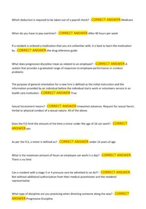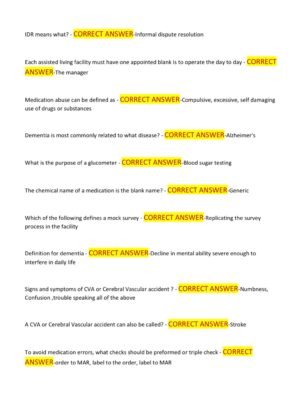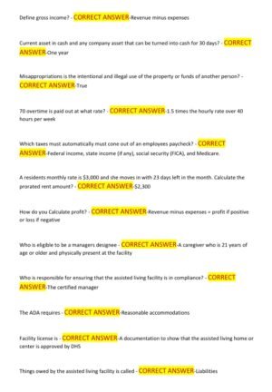 This document provides the 2025–2026 Assisted Living Manager final exam and practice exam, complete with detailed, verified correct answers. It covers essential topics including state regulations, resident care standards, safety protocols, facility management, and staff supervision. Designed for both preparation and final review, this updated resource is graded A+ and ideal for ensuring readiness for the Assisted Living Manager certification exam.