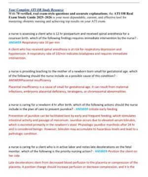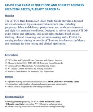 The ATI OB (Obstetrics) Real Exam Study Guide 2025–2026 is a complete and updated resource designed to help nursing students master maternal and newborn nursing concepts. Featuring 70 verified, real exam-style questions with correct and detailed answers, this A+ graded study guide reflects the latest ATI testing standards and clinical guidelines for 2025–2026. It ensures accurate, comprehensive preparation for both the ATI OB Proctored Exam and real-world obstetric nursing practice.