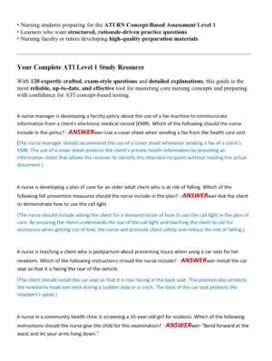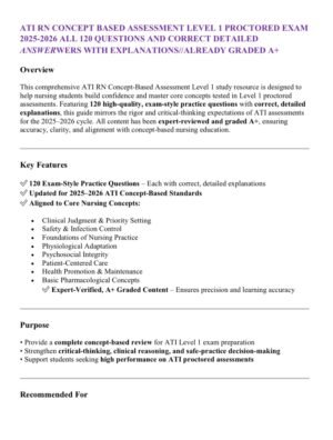 Be the first to review “ATI RN CONCEPT BASED ASSESSMENT LEVEL 1 PROCTORED EXAM 2025-2026 ALL 120 QUESTIONS AND CORRECT DETAILED ANSWERWERS WITH EXPLANATIONS//ALREADY GRADED A+”