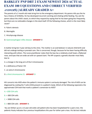 This document includes the Barkley Pediatric Nurse Practitioner (PNP) DRT 2 Exam – 2024 Latest Version, featuring 100 actual exam questions with verified correct answers. Content areas include growth and development, pediatric primary care, pharmacology, acute and chronic pediatric conditions, and evidence-based practice guidelines. Aligned with Barkley & Associates standards, this A+ graded resource is ideal for PNP students preparing for certification or comprehensive review exams, ensuring success through detailed answer rationales and clinical application scenarios.