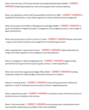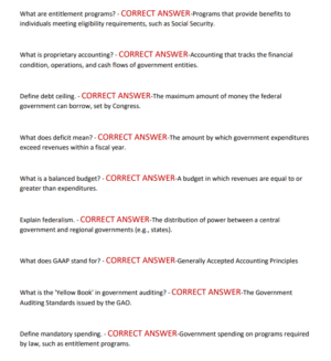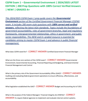 This 2024/2025 CGFM Exam 1 prep guide covers the Governmental Environment section of the Certified Government Financial Manager (CGFM) exam. It includes 200 exam-style questions with 100% correct and verified answers, reflecting the latest AGA standards. Topics include the foundations of government accountability, roles of government branches, legal and regulatory frameworks, intergovernmental relationships, ethics in government, and public sector responsibilities. This NEW and A+ graded resource is essential for candidates aiming to master CGFM Exam 1 and advance in public financial management.