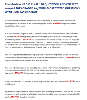 This document contains the 2025 updated version of the Chamberlain NR 511 Final Exam, featuring 120 verified questions with 100% correct answers. It includes the most frequently tested topics in Advanced Physical Assessment, covering differential diagnosis, clinical reasoning, patient presentations, systems-based assessments, and evidence-based decision-making. Structured to reflect the actual NR 511 exam format, this resource has been graded A+ and is trusted by students for its high passing rate. Perfect for final exam prep and confident clinical mastery.