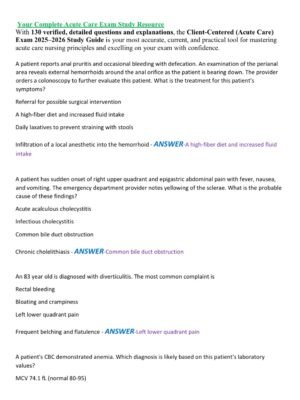 The Client-Centered (Acute Care) Exam 2025–2026 Study Guide is a comprehensive and up-to-date resource designed to help nursing students and healthcare professionals master acute care principles with a focus on client-centered practice. Featuring 130 actual exam-style questions with detailed, verified answers, this A-grade study guide aligns with the latest 2025–2026 clinical and educational standards, ensuring accurate, relevant, and effective preparation for success in both exams and clinical settings.