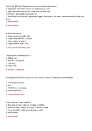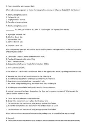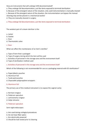 The CRCST Certification Final Exam Prep (2025–2026) is a top-tier study resource featuring 400+ carefully crafted practice questions with 100% correct, verified answers. Designed to align with the latest CRCST exam blueprint based on the 2023 job task analysis—including key domains such as Cleaning & Decontamination, Sterilization Processes, Packaging, Inventory Management, Patient Care Equipment, Documentation, Departmental & Environmental Considerations, and Professional Development—this resource provides comprehensive preparation rooted in authoritative standards such as the HSPA Technical Manual, ANSI/AAMI ST79, and AORN Guidelines HSPA+2HSPA+2.