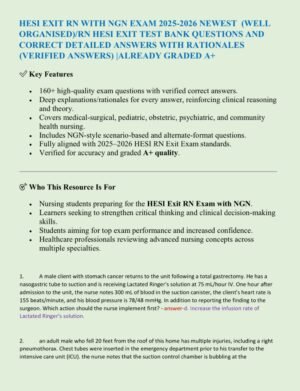 Be the first to review “HESI EXIT RN WITH NGN EXAM 2025-2026 NEWEST (WELL ORGANISED)/RN HESI EXIT TEST BANK QUESTIONS AND CORRECT DETAILED ANSWERS WITH RATIONALES (VERIFIED ANSWERS) |ALREADY GRADED A+”