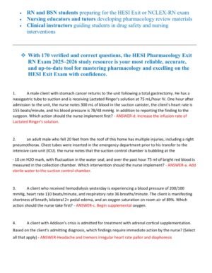 The HESI Pharmacology Exit RN Exam 2025–2026 provides a complete, up-to-date collection of 170 verified exam-style questions with correct answers, designed to reflect the latest HESI testing blueprint for nursing pharmacology. This A+ graded and newly updated version helps RN students master essential medication knowledge, dosage calculations, and pharmacotherapeutic principles — ensuring strong performance on both the HESI Exit and NCLEX-RN exams.