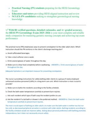 The HESI PN Gerontology Exam 2025–2026 provides a verified and up-to-date collection of 80 real exam-style questions with detailed rationales, ensuring a complete and accurate review of geriatric nursing concepts. Designed to reflect the latest HESI test blueprint for 2025–2026, this A+ graded resource helps PN students master the knowledge and critical thinking skills needed to care effectively for older adult patients.