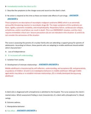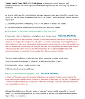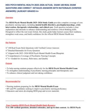 The HESI Psych Mental Health Exam 2025–2026 Study Guide is a comprehensive and up-to-date preparation resource designed to help nursing students excel on the HESI Mental Health exam. Featuring 100 real exam-style questions with verified correct answers and detailed rationales, this A+ graded guide mirrors the structure, difficulty, and focus of the actual HESI exam. Updated for the 2025–2026 testing cycle, it ensures mastery of psychiatric nursing concepts, therapeutic communication, and patient-centered care principles essential for clinical success.