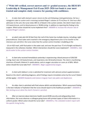 The HESI RN Leadership and Management Exit Exam 2025–2026 includes 160 verified, real exam-style questions with 100% correct answers, making it the most accurate and up-to-date resource for nursing students preparing for the HESI Leadership/Management assessment. This A+ graded test bank reflects the latest HESI blueprint, ensuring complete coverage of leadership roles, delegation, communication, and professional accountability in nursing practice.