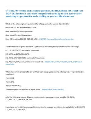 The H&R Block ITC Final Test 2025–2026 edition provides a complete and verified collection of 300 real exam-style questions and correct answers, designed to help learners master key concepts in individual income tax preparation. Updated for the latest 2025–2026 IRS guidelines and H&R Block training modules, this A+ graded resource ensures accurate, reliable, and comprehensive review for tax professionals and ITC students.