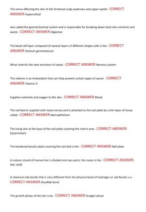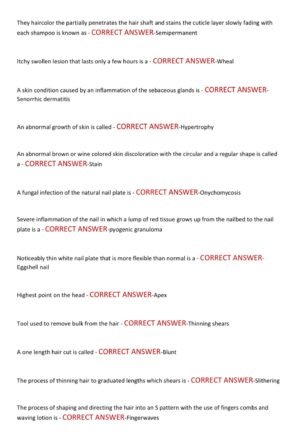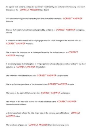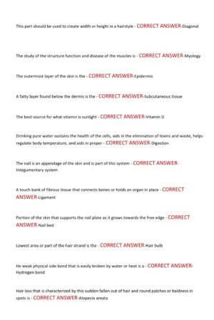 The Massachusetts Cosmetology State Board Actual Exam 2025–2026 is a fully updated exam preparation guide that includes 200 actual exam-style questions with correct and verified answers. This resource covers the latest and most tested topics required by the Massachusetts State Board, including sanitation and safety, hair care, skin and nail services, anatomy, physiology, state laws, and professional ethics. Designed to reflect the current 2025–2026 exam format and already graded A+, it is a trusted tool to help cosmetology students strengthen their knowledge, build test-taking confidence, and ensure success on the state licensure exam.