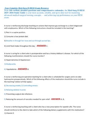 The Med-Surg II HESI 2025–2026 Study Guide is a comprehensive and up-to-date preparation resource designed to help nursing students excel on the Medical-Surgical Nursing II HESI Exam. Featuring 140 verified exam-style questions with correct, detailed answers, this A-graded study guide aligns with the latest 2025–2026 HESI exam standards, ensuring accuracy, depth, and real-world clinical relevance.
