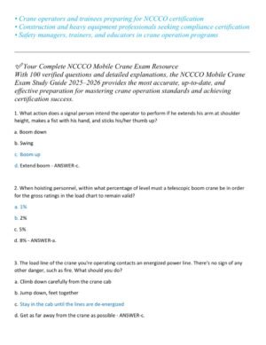 The NCCCO Mobile Crane Certification Exam Study Guide (2025–2026) is a complete and verified resource featuring 100 real exam-style questions with detailed, correct answers, designed to help candidates prepare effectively for the National Commission for the Certification of Crane Operators (NCCCO) Mobile Crane Exam. Updated for the 2025–2026 testing standards, this A-graded study guide ensures accuracy, clarity, and alignment with current NCCCO certification objectives.
