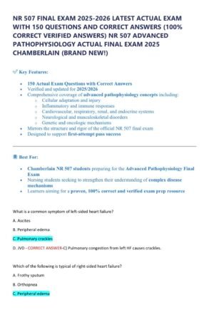 This NR 507 Advanced Pathophysiology Final Exam study resource is specifically designed for Chamberlain students preparing for the 2025–2026 exam. It contains 150 practice questions with 100% verified correct answers, providing clear, detailed explanations to reinforce critical pathophysiology concepts. Perfect for focused review, it helps students identify knowledge gaps, strengthen clinical reasoning, and approach the final exam with confidence.
