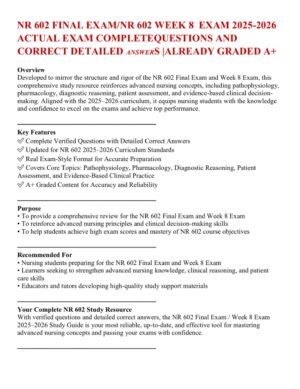 Be the first to review “NR 602 FINAL EXAM/NR 602 WEEK 8 EXAM 2025-2026 ACTUAL EXAM COMPLETEQUESTIONS AND CORRECT DETAILED ANSWERS |ALREADY GRADED A+”