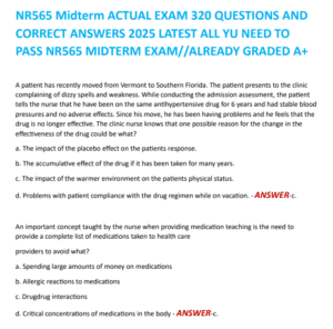 This document provides the complete 2025 NR565 midterm exam, featuring 320 multiple-choice questions along with accurate answers. Topics include drug classifications, pharmacokinetics, prescribing practices, adverse reactions, drug interactions, and patient-specific considerations in pharmacologic therapy. Graded A+, this comprehensive and updated midterm resource is ideal for students aiming to pass NR565 with confidence.