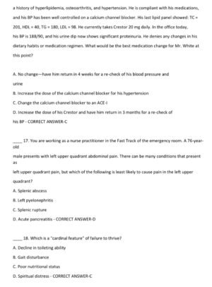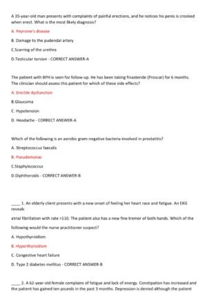 This document contains 300 actual NR601 Final Exam questions with correct answers, focusing on the most commonly tested topics. It covers adult and geriatric primary care, diagnostic reasoning, pharmacology, chronic disease management, preventive health strategies, and evidence-based guidelines. Updated to match current NR601 course content, this graded A+ resource provides a complete and reliable study tool for exam success.