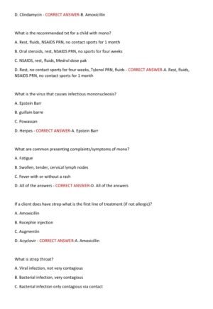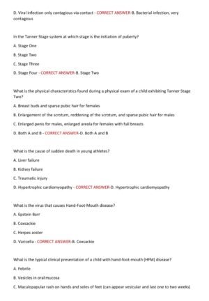The NURS 629 Pediatrics Actual Exam (Maryville University) 2025/2026 provides a complete exam review package with 200+ real exam questions and 100% correct verified answers. This Peds Exam 1 test bank is fully updated to match the latest 2025/2026 curriculum, helping students master pediatric nursing concepts such as growth and development, pediatric assessment, common childhood diseases, pharmacology, fluid and electrolyte balance, immunizations, and evidence-based care for infants, children, and adolescents. Designed for accuracy and reliability, this study resource ensures learners are well-prepared and confident for the NURS 629 exam.
