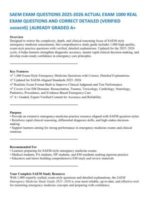 Be the first to review “SAEM EXAM QUESTIONS 2025-2026 ACTUAL EXAM 1000 REAL EXAM QUESTIONS AND CORRECT DETAILED (VERIFIED ANSWERS) |ALREADY GRADED A+”