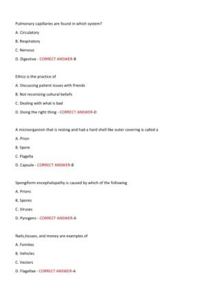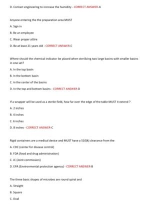 This Sterile Processing Final Exam Prep includes 100 updated exam-style questions with correct answers, reflecting the 2025–2026 testing format and the most commonly tested topics. Designed for learners preparing for IAHCSMM CRCST or CBSPD certification, this resource covers critical areas such as decontamination, sterilization methods, microbiology, instrument handling, surgical packaging, storage/distribution, infection prevention, and quality assurance. Each question is paired with the correct answer to ensure targeted learning and confidence building. Graded A+, this exam prep provides a reliable way to review essential concepts, improve recall, and maximize performance on test day.