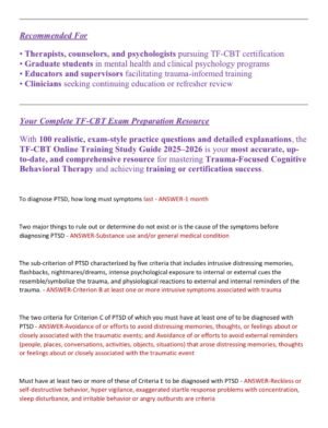 The TF-CBT Online Training Study Guide 2025–2026 provides a complete review of Trauma-Focused Cognitive Behavioral Therapy concepts, interventions, and treatment strategies, designed to help clinicians and trainees build mastery and confidence. Featuring 100 expertly crafted, exam-style practice questions with detailed explanations, this A-graded resource mirrors the structure and complexity of the official TF-CBT online certification exam while focusing on practical understanding and clinical application.