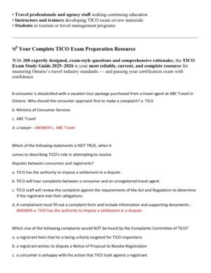 The TICO Exam Study Guide 2025–2026 provides a complete and up-to-date review of the Travel Industry Council of Ontario (TICO) certification standards. Featuring 200 exam-style practice questions with detailed explanations, this A+ quality resource helps travel professionals and students master key concepts in Ontario travel law, consumer protection, and ethical business practice.