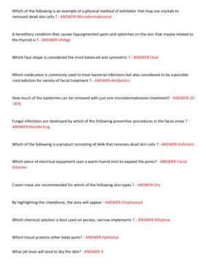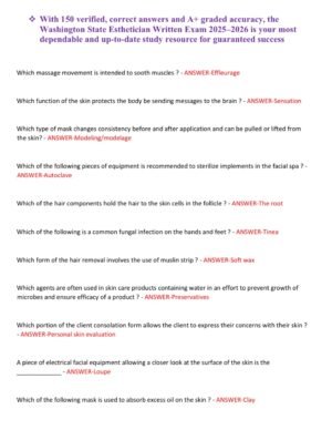 The Washington State Esthetician Written Exam 2025–2026 study guide features 150 verified, real exam-style questions with 100% correct answers, making it the most complete and reliable preparation resource available. This A+ graded version is updated to match the latest Washington Department of Licensing (DOL) esthetics exam standards, ensuring that candidates are fully prepared for every topic tested on the written portion of the state board exam.
