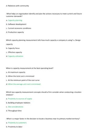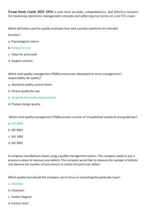 The WGU C215 Pre-Assessment Exam Study Guide 2025–2026 is a complete and up-to-date resource designed to help students prepare effectively for the WGU C215 Operations Management Objective Assessment (OA). Featuring 70 verified, exam-style questions with correct and detailed answers, this A+ graded guide reflects the latest course updates and exam standards for 2025–2026. It serves as an excellent tool for reinforcing key concepts and building confidence before taking the actual C215 OA exam.