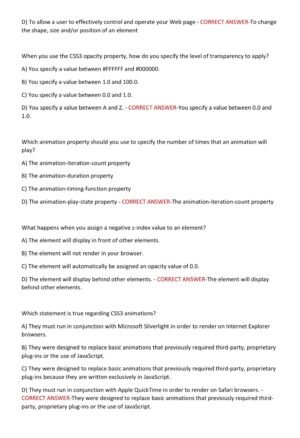 The WGU C777 Web Development Applications course focuses on building, styling, and deploying web applications using modern technologies. Students are expected to demonstrate proficiency in HTML5, CSS3, JavaScript, and responsive design principles, while also understanding accessibility standards, form validation, DOM manipulation, and client–server communication. The assessment emphasizes not only coding accuracy but also best practices in usability, semantic markup, and troubleshooting common web development issues. By successfully preparing for this exam, learners show competency in creating functional, user-friendly, and standards-compliant web applications that reflect industry expectations.