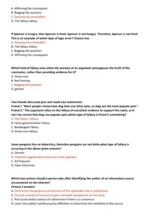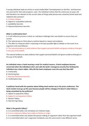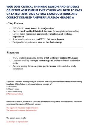 This comprehensive resource for WGU D265: Critical Thinking, Reason, and Evidence is designed to help students confidently prepare for the Objective Assessment. It covers all key concepts needed to pass, with clearly explained questions and detailed, accurate answers aligned to the latest 2025–2026 exam format. The material is structured to reinforce critical thinking skills, improve reasoning with evidence, and support effective exam readiness for students aiming to succeed on their first attempt.