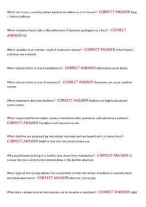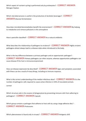 The WGU D311 Microbiology 2025–2026 Study Resource is a comprehensive and updated exam preparation guide designed to help learners succeed in their online assessment. It features 200 actual exam-style questions with correct, verified answers, focusing on the most frequently tested microbiology concepts. With a proven 90% pass rate, this resource is tailored to strengthen understanding of core topics such as microbial physiology, genetics, immunology, and pathogenic microorganisms. It serves as an effective study aid to boost confidence, ensure mastery of critical concepts, and support learners in achieving an A+ grade on their first attempt.